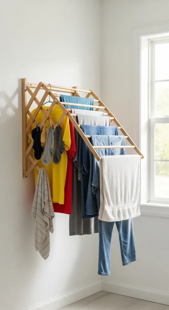 A wall-mounted fold-flat drying rack gives you extra drying space without taking up permanent room. When not in use, it folds neatly against the wall and almost disappears. This keeps floors and counters free from damp clothes. Install it above a counter or near a window for airflow. It works especially well for delicates and items that should not go in the dryer. Many versions are affordable and simple to mount with basic tools. Having a dedicated drying area keeps laundry from spreading into other parts of the house. It is a small upgrade that adds daily convenience while keeping the room organized.