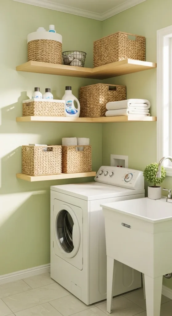Corner floating shelves turn unused wall corners into practical storage. These small shelves are perfect for lightweight baskets, jars, or folded cloths. Installing shelves higher up keeps them out of the way while still adding storage. Using matching containers helps maintain a neat appearance. Corner shelving is especially useful in compact laundry rooms where every inch matters. This simple addition prevents clutter from building up on main walls or countertops. Even one set of corner shelves can create extra space that feels purposeful and organized.