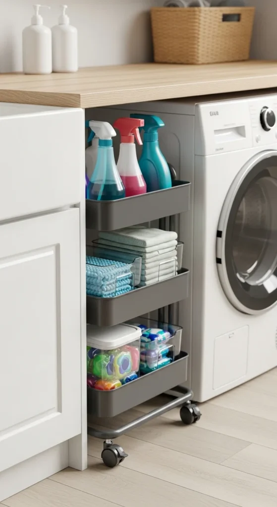 A slim rolling cart under the counter provides flexible storage for frequently used items. It can be pulled out during laundry tasks and tucked back when finished. This keeps supplies easy to reach but off visible surfaces. Choose a narrow design that fits snugly in the gap. Use small bins on each tier to keep items grouped. This setup works well for detergents, cloths, or spray bottles. Mobile storage like this adds convenience without permanent installation.
