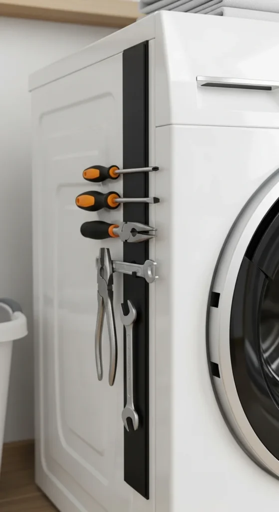 Magnetic storage strips make use of the metal sides of washers and dryers. Attach small metal tools like scissors, clips, or measuring scoops directly to the strip. This keeps tools off shelves and within easy reach. Installation is quick and does not require drilling. Using appliance sides for storage frees up wall and counter space. It is a simple trick that keeps small essentials from getting lost.