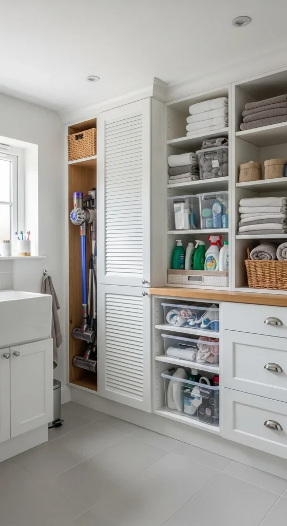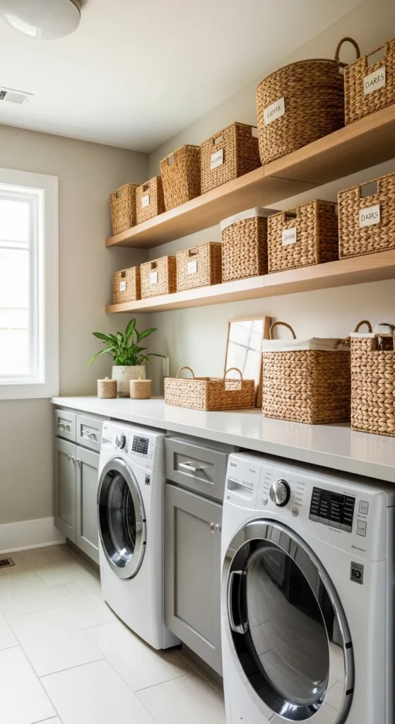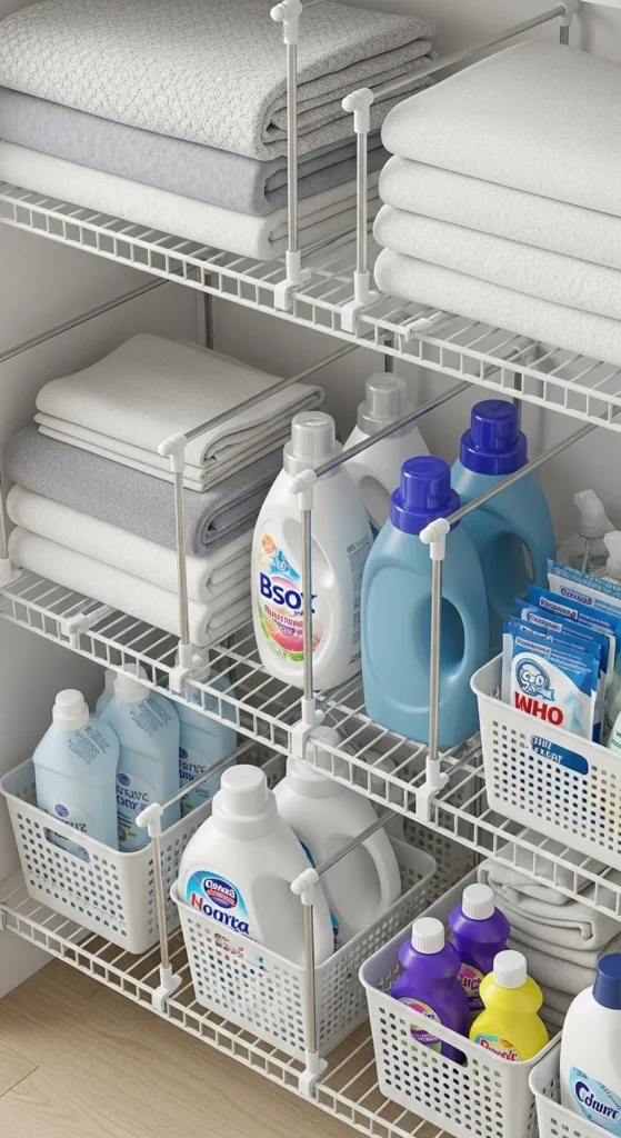A cubby system with baskets makes it easy to sort and store items. Each basket can hold a specific category, like cleaning cloths or dryer sheets. Labels help everyone in the household know where things belong. Baskets hide loose items while keeping them accessible. This system keeps shelves looking tidy and organized.