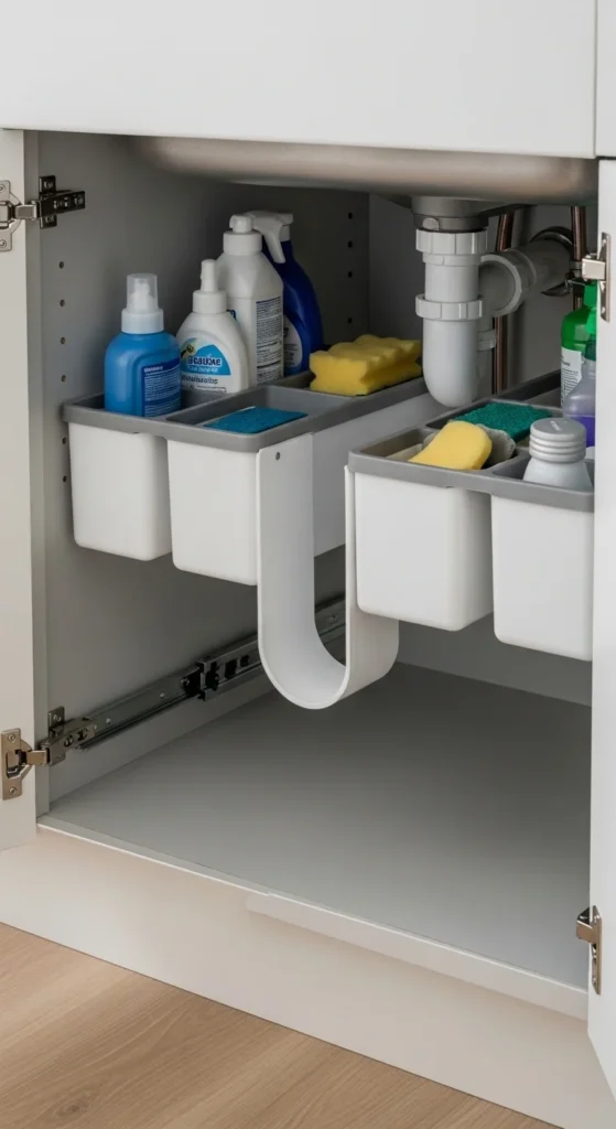 The space under a laundry sink often goes unused because of plumbing pipes. A pull-out organizer with cutouts for pipes turns this hidden area into useful storage. Store cleaners, sponges, or extra cloths here. Sliding trays make it easy to reach items at the back. This keeps cleaning supplies out of sight but still accessible. Using this overlooked area helps reduce clutter elsewhere in the room.