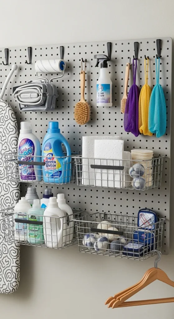 A pegboard wall organizer provides flexible storage that can change over time. Hooks, baskets, and small shelves can be rearranged as your needs shift. Hang lint rollers, brushes, or small bags to keep them visible and tidy. Pegboards use vertical wall space efficiently. This keeps small tools from cluttering drawers or counters. It is an affordable solution that adds both organization and easy access.