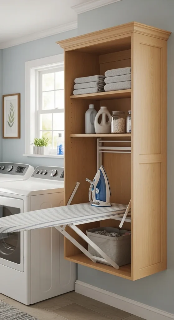 A built-in ironing station folds down when needed and hides away afterward. This saves floor space and keeps the room looking tidy. Installing one inside a cabinet or wall niche keeps equipment out of sight. It also makes ironing more convenient since the board is always ready. Fold-away designs are great for small rooms where storage is limited.