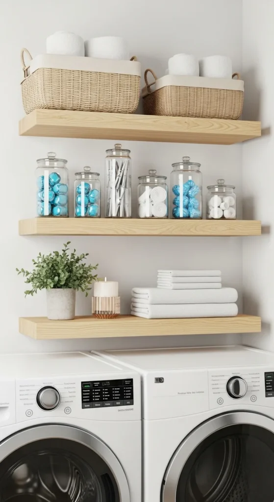 Floating shelves above the washer and dryer add storage without bulky furniture. This wall area is often empty, yet it is perfect for baskets and jars that hold everyday supplies. Use matching containers to keep the shelves looking neat. Sturdy brackets hidden beneath wood planks provide strong support for heavier items. Keeping detergent pods, cloths, and small tools in bins prevents loose clutter. Adjustable shelf height allows space for taller bottles or stacked baskets. This simple upgrade keeps frequently used items within reach while freeing up counter space. It is an easy weekend project that adds both function and style.