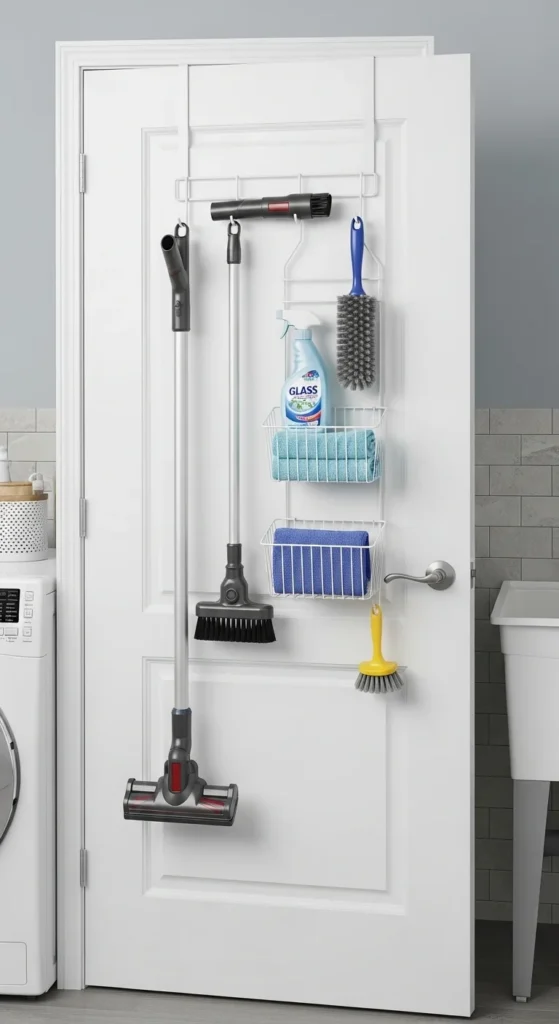 An over-door rack adds storage without using wall or floor space. Hang lightweight tools, cloth bags, or accessories here. No drilling makes this solution renter-friendly. The back of the door becomes useful storage instead of wasted space. This helps keep small items from cluttering shelves.