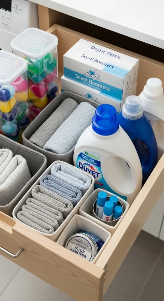 Deep drawers hold supplies out of sight while keeping them easy to reach. Use internal dividers or bins to keep items grouped. This prevents bottles from tipping over and making a mess. Storing supplies in drawers instead of on open shelves reduces visual clutter. It also keeps counters free for folding tasks.