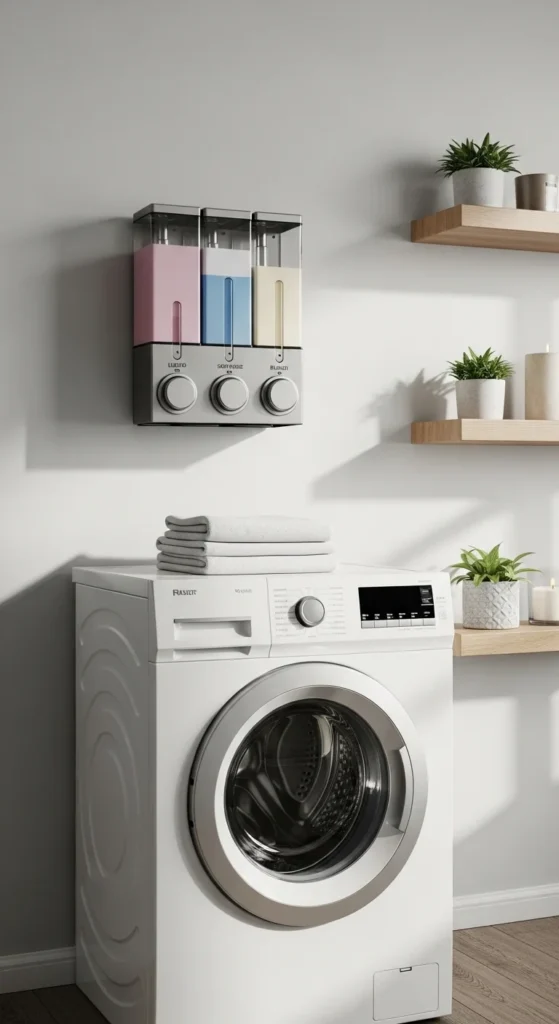 A wall-mounted detergent dispenser reduces bottle clutter and sticky drips. It provides measured amounts directly into the washer. Mounting it above the machine keeps the counter clear. This solution is helpful for bulk liquid detergent. It keeps everything neat and easy to use.