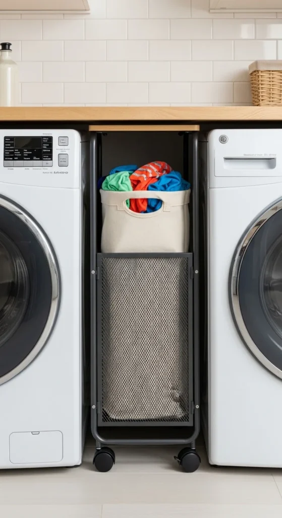 A slim rolling hamper fits perfectly into narrow gaps between appliances. This turns unused space into a practical storage area. Wheels make it easy to move loads to the washer. Keeping laundry contained prevents piles from forming on the floor. This small addition makes a big difference in keeping the room tidy.