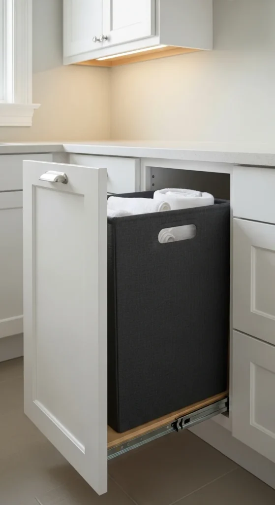 Pull-out hamper drawers hide dirty laundry inside cabinets, keeping floors clear. Sliding frames allow you to sort clothes directly into separate bins. This prevents piles from forming in corners or hallways. Built-in hampers also make sorting easier for the whole household. Each bin can be assigned to whites, darks, or delicates. The drawers glide out smoothly, then disappear behind closed doors. This keeps the room looking tidy even on busy laundry days. Adding pull-out hampers is a practical way to combine storage and organization in one hidden feature.