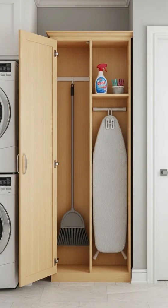 A slim vertical cabinet fits into narrow gaps that would otherwise go unused. This tall design is ideal for storing brooms, mops, and ironing boards upright. Keeping these long tools hidden prevents them from leaning in corners. Adjustable interior hooks or shelves can hold smaller accessories like spray bottles or dustpans. Even a cabinet just a few inches wide can make a big difference. Vertical storage keeps tools organized without taking valuable floor space. This simple addition helps the room feel less crowded and more functional.