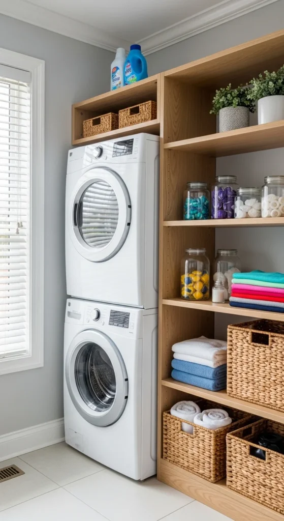 Stacking the washer and dryer frees up floor space for additional storage. The open area beside or below can be used for cabinets, shelves, or a folding counter. Many modern stacking kits are safe and easy to install. This setup works especially well in small laundry closets. The extra vertical layout creates room for tall storage units. It also improves traffic flow in tight areas. Making use of height instead of width helps the room feel more open and organized.