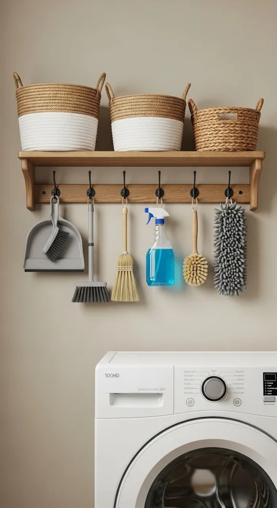 A shelf with hooks above machines adds double-duty storage. The top shelf holds baskets or jars for supplies. Hooks underneath can hang lint rollers, reusable bags, or small brushes. This keeps tools visible but off counters. Combining shelf and hook storage uses wall space efficiently. It also creates a clear home for items that usually float around. Keeping everything in one spot makes laundry tasks smoother and faster.