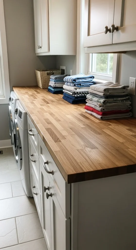 A built-in folding counter provides a dedicated surface for sorting and folding clothes. This keeps laundry from spreading into other rooms. Wood or laminate surfaces are durable and easy to clean. Adding a counter over cabinets also hides storage underneath. Keeping this surface mostly clear maintains a tidy appearance. Even a simple DIY board mounted securely can create the same benefit. Having one central workspace improves the overall flow of the room.
