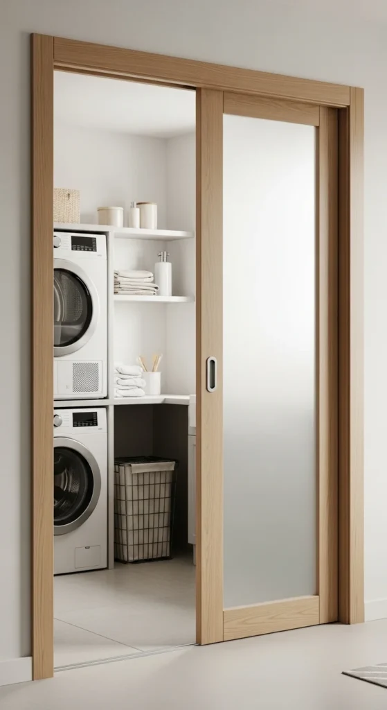 Sliding or pocket doors save floor space compared to traditional swing doors. They allow easier movement in tight laundry areas. This change makes the entrance feel less cramped. Doors that slide into the wall also keep pathways clear. It is a practical solution for small homes or hallway laundry closets. Saving space at the entry helps the entire room function better.