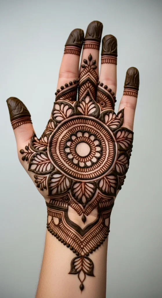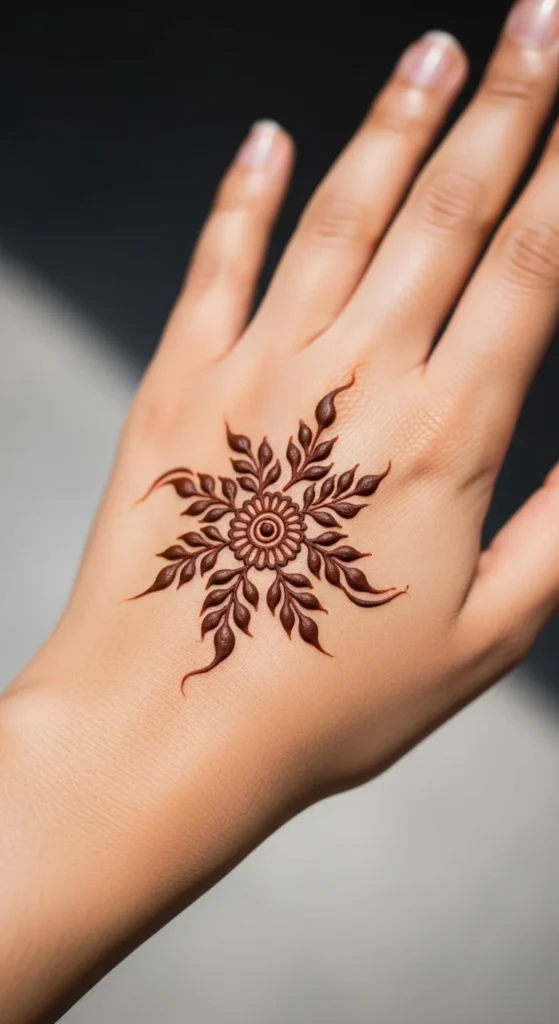 A mirrored leafy mandala is a lovely option if you enjoy balanced designs. Start with a small circle, dot cluster, or tiny floral center in the middle of the palm. Then place leaf bunches around it in even directions so the pattern feels symmetrical. The leaves act like soft rays coming out from the center, which gives the design a natural mandala effect without looking too dense. This style is easier than it seems because you can build it in sections. First place four main leafy shapes at the top, bottom, left, and right. Then fill the spaces between them with smaller leaves or dots. If you keep repeating the same leaf shape, the whole pattern looks neat and intentional. This is a beautiful style for festive days, engagement functions, or someone who wants a centered palm design that is not too complicated. It also helps beginners practice spacing and balance. A mirror-style design looks best when the leaves are similar in size, so take your time with the first few shapes. Once the center is balanced, the rest becomes much easier to complete.