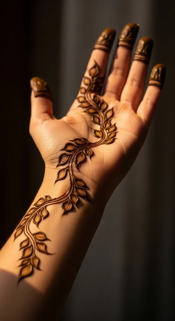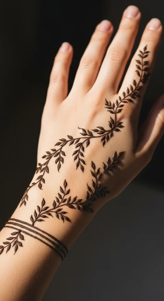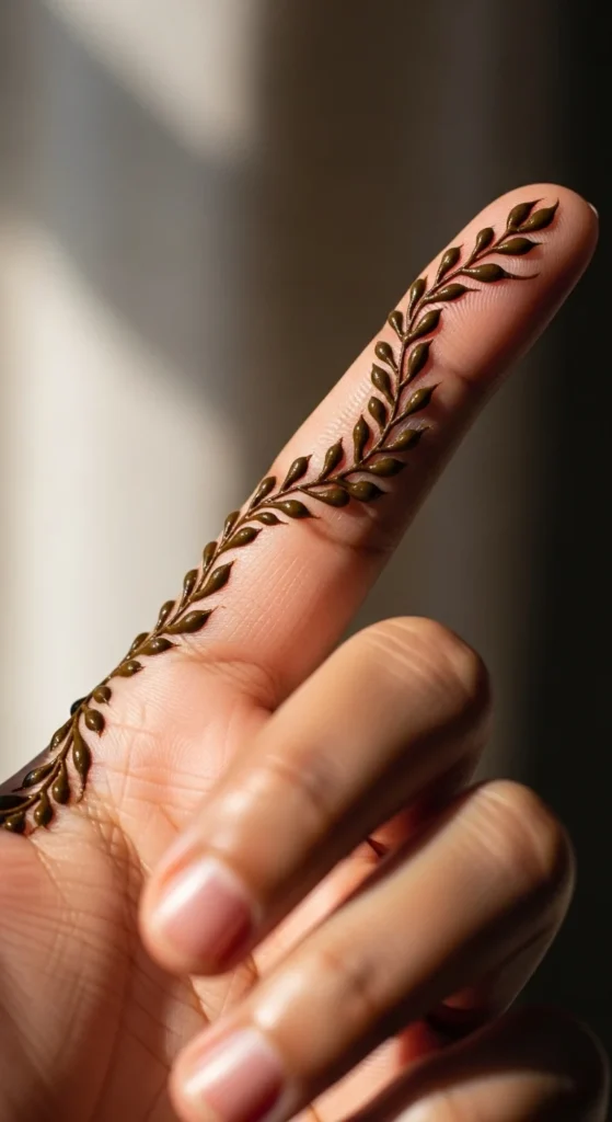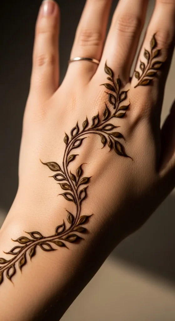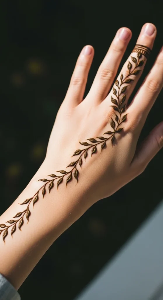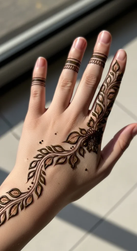 Whisper vines are soft side-finger trails that add just enough detail without taking over the whole hand. Start from the side of the palm or near the thumb base and let a very thin vine travel toward one finger. Add tiny leaves along only one side or in small paired groups. This keeps the pattern light and graceful. It is one of the easiest leafy mehndi ideas for someone who wants a minimal look. Because the design is narrow, it is fast to apply and easy to match on the other hand if needed. This style also works well when you want to pair mehndi with rings, since the finger is decorated but not overloaded. A nice trick is to keep the leaves closest to the fingertip very tiny. That makes the whole vine look more delicate. Add one or two dots only if the line feels too plain. Whisper vines are great for workdays, college events, and casual gatherings because they are subtle but still pretty. They prove that even a very small mehndi pattern can feel stylish and complete.