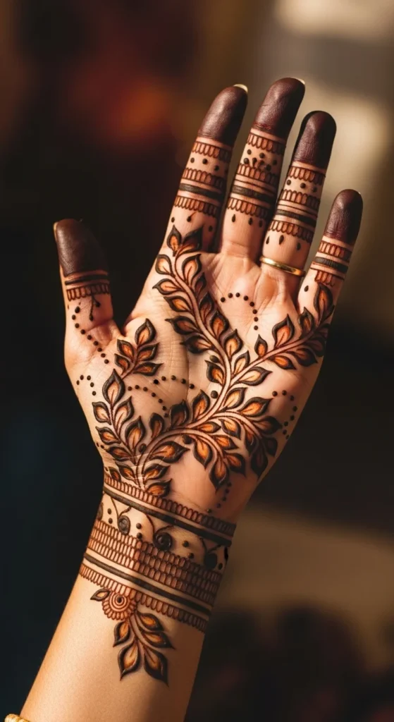 Leafy mehndi designs are popular because they feel light, graceful, and easy to wear for both casual days and festive moments. Instead of dense fills and very heavy motifs, this style uses leaf bunches, slim vines, dots, and soft Arabic-inspired flow to create a natural look that still feels polished. Many 2026 mehndi trends lean toward back-hand leafy layouts, finger trails, wrist cuffs, and open spaces that let the design breathe while keeping the hand elegant. These ideas are especially helpful for beginners because one leaf shape can be repeated in many ways, which makes the design look stylish without feeling hard to draw.