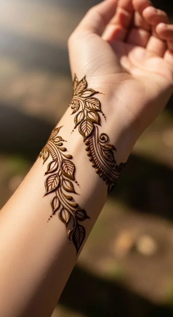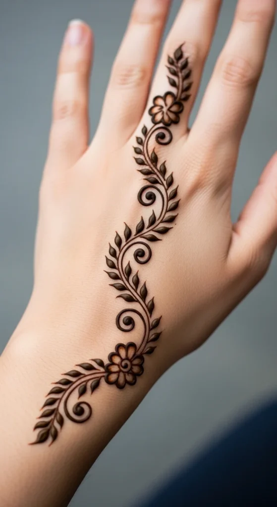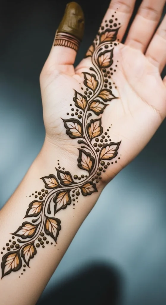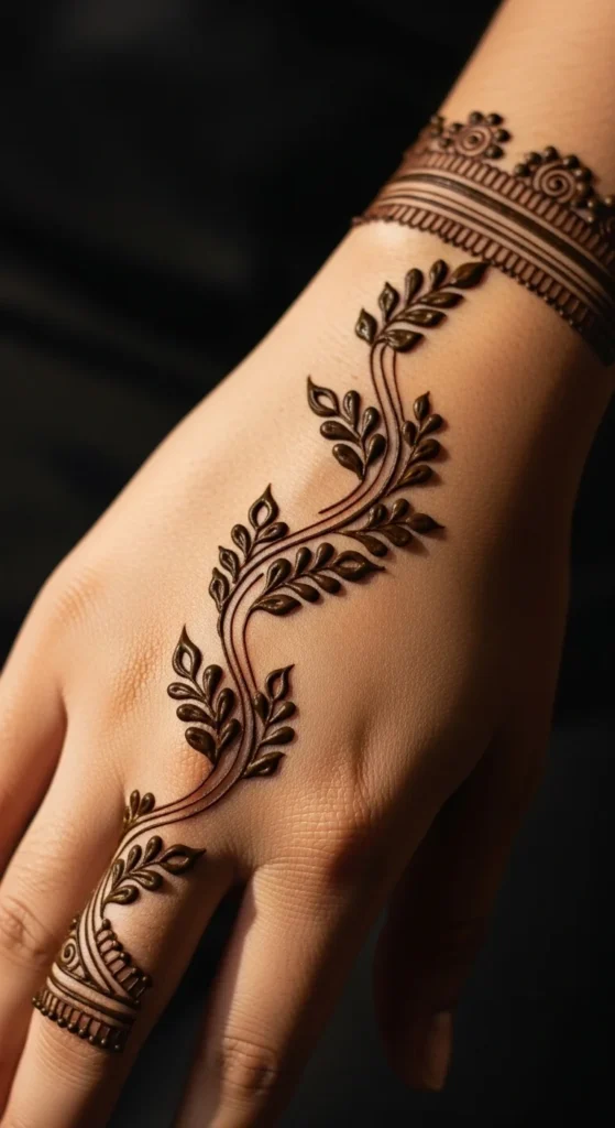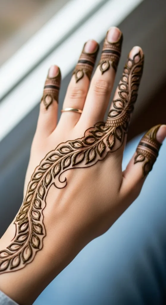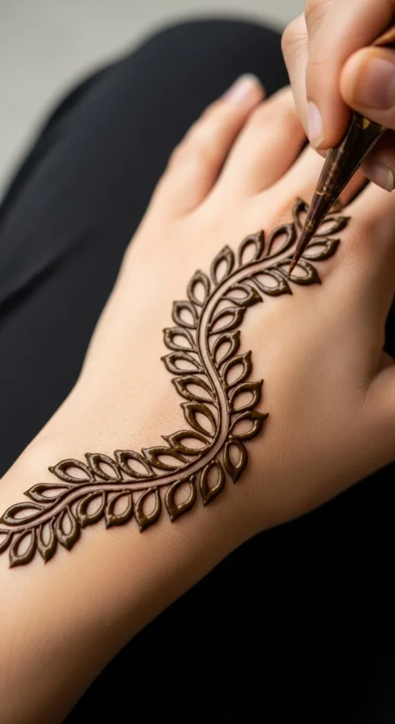 If you are still building confidence, the best leafy mehndi design is one made from repeated simple leaves. Start with one curved line. Then place one leaf on the left, one on the right, and repeat. That is it. You do not need a complex motif to make mehndi look good. This kind of pattern helps your hand learn muscle memory. After a few rows, your leaves start becoming more even and your cone pressure improves naturally. It also makes planning much easier because you are not guessing what to draw next. You can place this repeated leaf design diagonally across the back hand, around the wrist like a bracelet, or down a finger as a side trail. If the layout feels too plain, add small dots between every second pair of leaves. That simple addition can make the whole design look more finished. This is also a smart way to practice on paper, plastic sheets, or glass before applying mehndi on skin. One-leaf-at-a-time practice may look basic, but it often creates some of the prettiest simple mehndi patterns because the repetition feels calm, clean, and stylish.