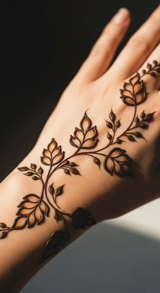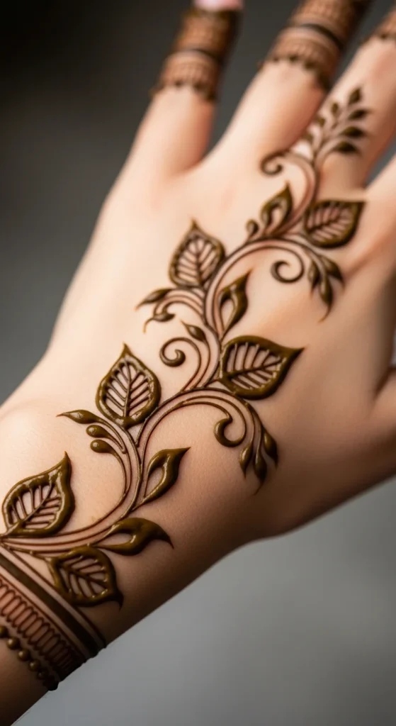 Aftercare matters a lot when you want your leafy mehndi to stain nicely. This idea focuses on simple vine trails that are easy to keep safe while drying. A back-hand leafy pattern works especially well because you can hold your hand upward without smudging too much. Start with a soft vine and leaf bunch design, then once it is done, keep the hand as still as possible while the paste begins to dry. Avoid touching clothes, hair, or your phone during that stage. If you want a deeper stain, let the mehndi sit longer and avoid washing the area too soon. A simple sugar and lemon dab can help the dried paste stay on longer, but use only a little so the design does not smear. This style is ideal for beginners because the pattern itself is easy and the aftercare is manageable. Since the design has open space, it is less likely to smudge into a dense mess. A clean leafy trail with good drying habits can stain beautifully and look much richer the next day.