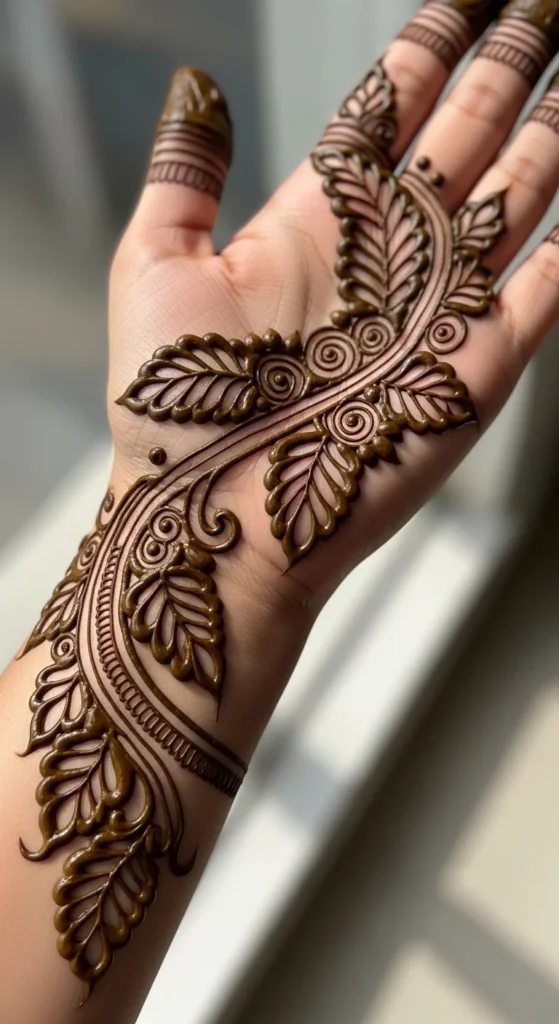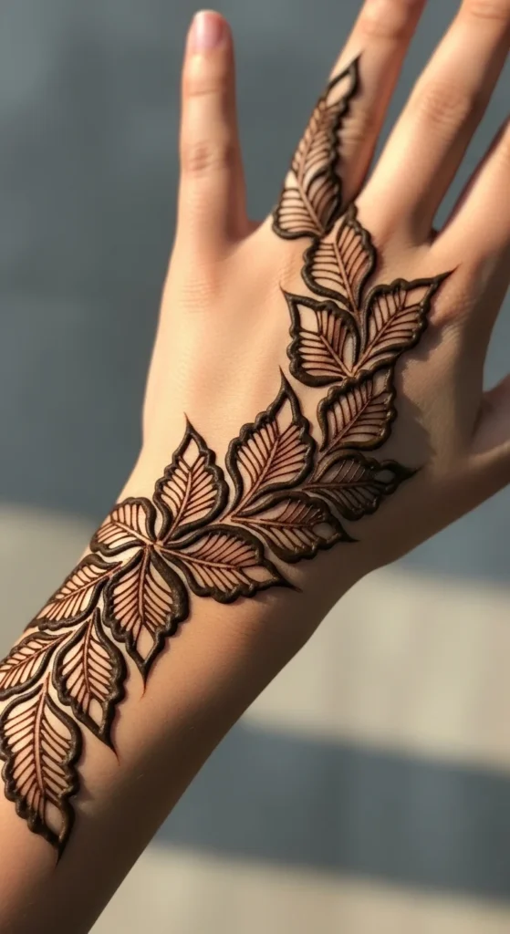 Bold leafy outlines are very useful when you are still learning cone control. Thin lines can wobble if your hand is not steady yet, but a slightly bolder stroke often looks cleaner and more intentional. Start with a medium-thick stem, then draw leaf shapes with clear outer edges. You can leave the inside open or add one tiny line through the center of each leaf. This style looks especially nice on the back hand and wrist because the bold outlines stand out well without needing a lot of filling. It also helps the stain look sharper after the mehndi dries. A good beginner trick is to cut your cone tip so the paste flows smoothly but not too fast. If it comes out unevenly, test the pressure on paper or glass first. Bold leafy mehndi works well for simple festive looks because it is easy to see from a distance and still feels elegant. You can pair it with dots, a curved wrist trail, or a small finger pattern. If you want a leafy design that looks stylish and beginner-friendly at the same time, bold outlines are a very strong option.