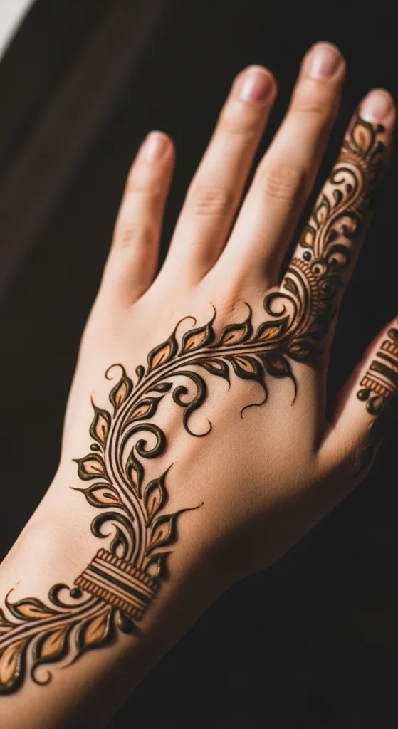 Some of the prettiest mehndi designs look beautiful because they leave space. A breathable leafy branch design uses thin curved lines, small leaves, and wide open areas so the hand looks neat and soft rather than dense. Begin with one slim branch and add leaves only in selected sections instead of covering every inch of the line. This makes the design feel more natural, like a real plant stem moving across the skin. If you want a modern simple mehndi look, this style works very well. It is also budget-friendly because it uses less henna paste than full-hand fills. If you are new to mehndi, sketch the main path lightly with a washable pencil first. Then follow that shape with your cone. Keep the leaves slim and pointed, and avoid making them too thick. A few tiny dots can be placed near the leaf tips for softness. This style is nice for college, daily wear, and small festive occasions because it feels dressed up without looking too heavy. The open space is what gives it charm, so let the design breathe.