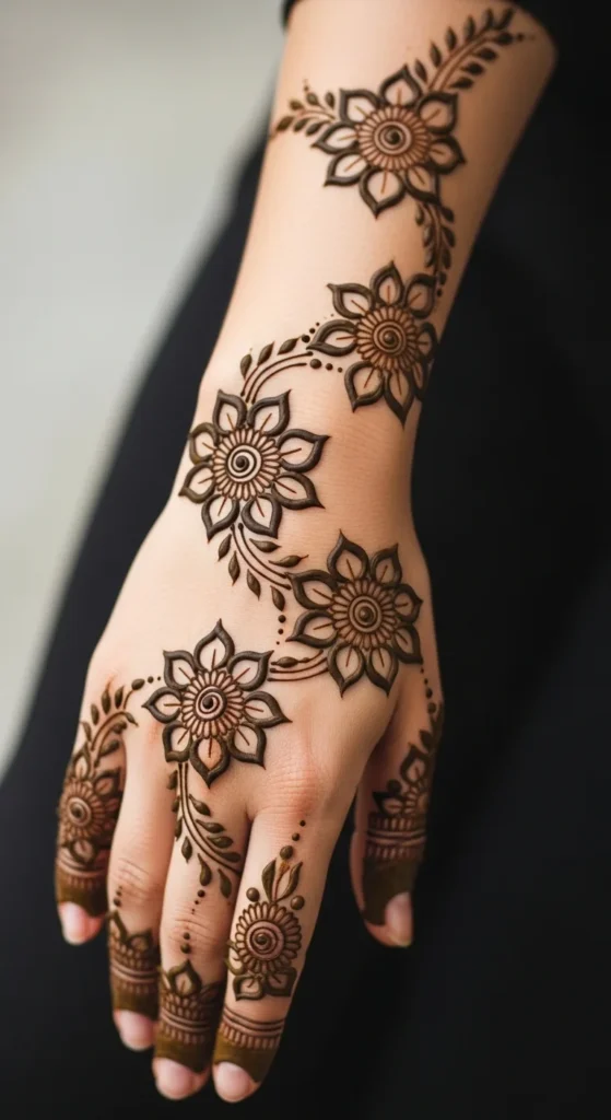 A leafy wrist cuff is a great way to wear mehndi like jewelry. Start by drawing a curved band around the wrist, then decorate it with tiny vines, leaf bunches, or repeated leaf pairs. The result looks like a natural bracelet and works beautifully even if the rest of the hand is left plain. This is very useful if you want a stylish mehndi look but do not have time for a full back-hand pattern. You can keep the band slim and delicate or make it slightly wider by adding a second vine above it. If you want the bracelet to feel more festive, place dots between the leaf groups or add one tiny floral swirl in the center. This design is also easy for beginners because the wrist gives you a clear path to follow. Just keep the leaves angled in the same direction for a neater result. A leafy cuff is lovely for Eid, brunches, or small family events because it looks decorative and still stays simple. It also pairs nicely with bangles since the pattern sits naturally where jewelry would.