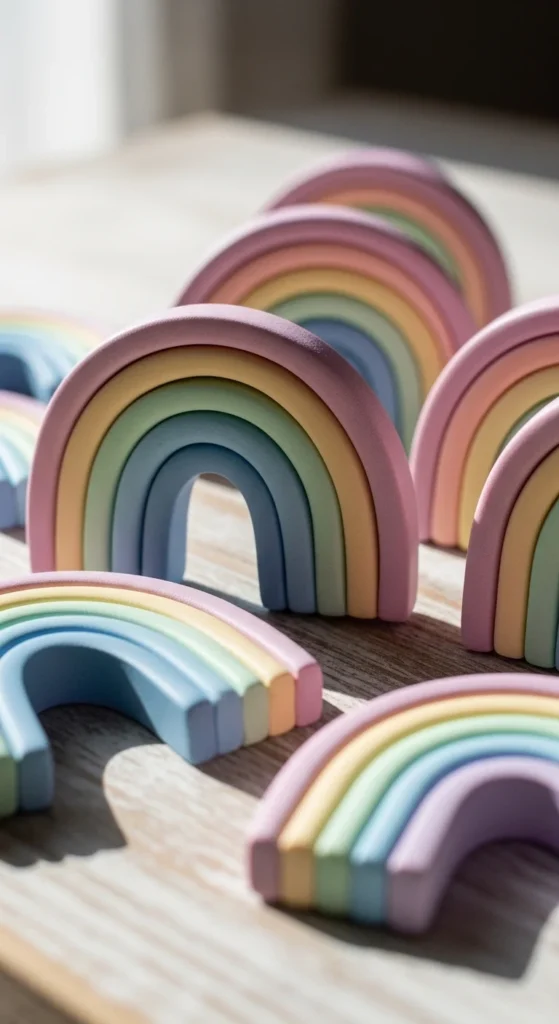 Mini rainbow arches are cheerful and simple to build. Roll thin clay strands in different colors and curve them into arches. Stack from largest to smallest and press gently so they stick. Smooth the sides lightly. Once dry, seal if desired. These rainbows brighten desks or nurseries and help beginners practice rolling even coils.