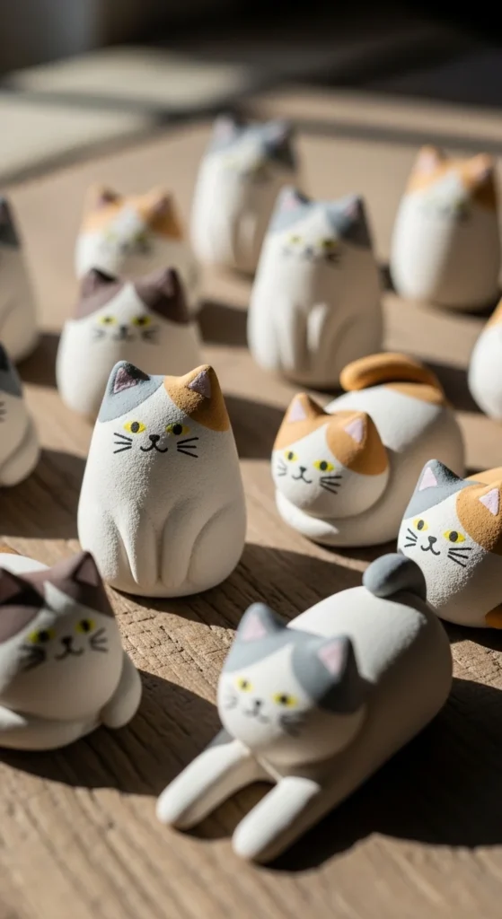 Tiny cats start with an oval body and round head. Add small triangle ears and a thin tail. Smooth the joints and press tiny marks for eyes. Paint in simple colors after drying. These cats make cute decorations and help beginners practice forming smooth rounded shapes.