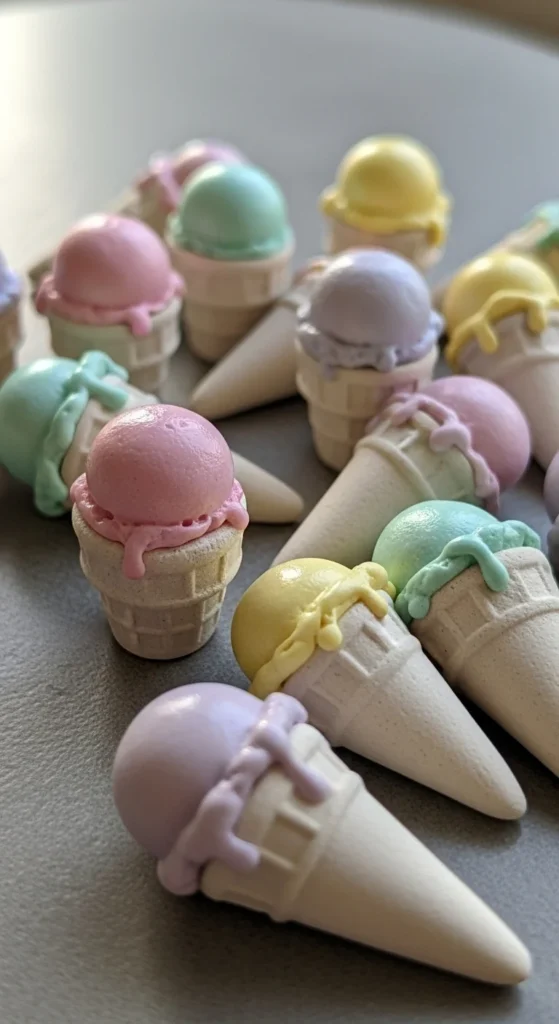 Mini ice cream cones combine texture and stacking. Shape a small cone and add cross lines for detail. Roll a ball for the scoop and attach it on top. Add sprinkles before drying. Paint in pastel shades afterward. These are fun charms that help beginners practice adding texture and layering shapes.