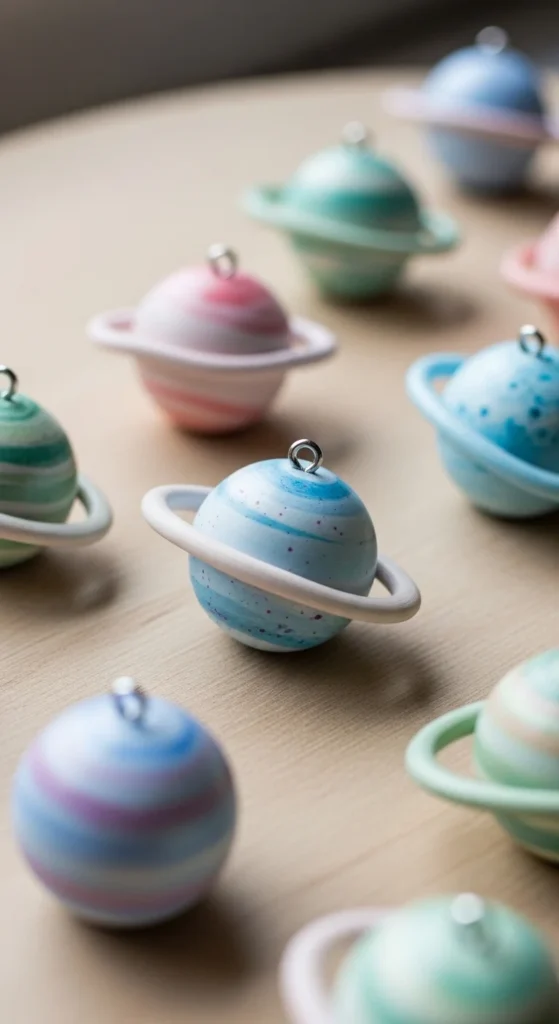 Little planets are smooth and round, making them great for practicing spheres. Roll a ball and add a thin ring around the middle. After drying, paint in blues or purples and add dots or swirls. These mini planets work well as charms and help beginners refine smooth surfaces.