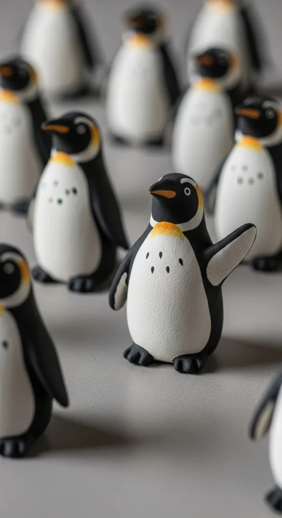Mini penguins are great for practicing clean color sections and smooth shapes. Start with a small oval for the body and gently flatten the base so it stands upright without wobbling. Add two tiny side flippers using small teardrop pieces and smooth the joins with your fingertip. Form a small rounded head on top and press lightly to secure it in place. Use a toothpick to mark tiny eye spots and a small triangle beak area before drying. Once hardened, paint the body black and the belly white, keeping edges simple and bold. Add a small orange beak and feet for contrast. These penguins look adorable in winter displays or as shelf decor and help beginners practice stacking basic shapes and neat paint placement without complicated tools.