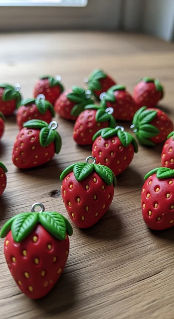 Tiny strawberries are perfect for learning surface texture in a simple way. Roll a small teardrop shape and gently flatten the top where the leaves will sit. Use a toothpick to press tiny dot indents across the surface to create the seed pattern. Keep the spacing uneven for a more natural look. Add a small star-shaped leaf cap on top using a thin flattened piece of clay. Make a tiny hole near the stem if you want to turn it into a charm. After drying, paint the berry red and the leaves green, then add tiny yellow dots for seeds. These strawberries work well as keychains or jewelry pieces and help beginners practice shaping small forms and repeating details.
