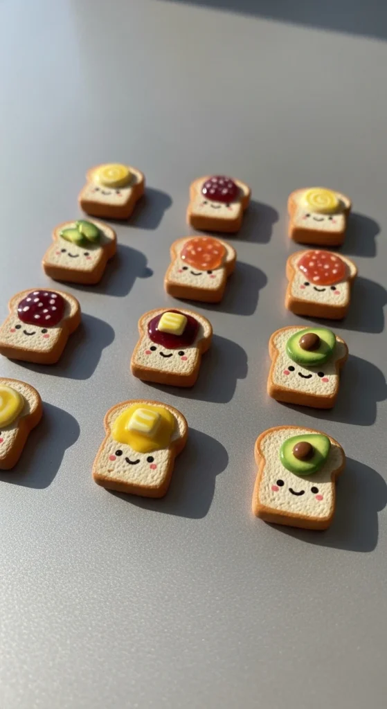 Mini toast faces are fun and easy because they rely on simple rounded square shapes. Roll clay flat and cut or shape a small rectangle with softly rounded corners. Press a thin border line near the edge to create the crust detail. Add tiny raised shapes on top to represent butter, jam, or fruit slices. Use a toothpick to mark a small smiling face before drying. Once hardened, paint the toast a warm golden brown and color the toppings in bright shades. Keep facial details minimal so they stay cute and clear. These mini toasts can become magnets, charms, or playful desk decorations and help beginners practice flattening clay evenly and adding small raised decorations.