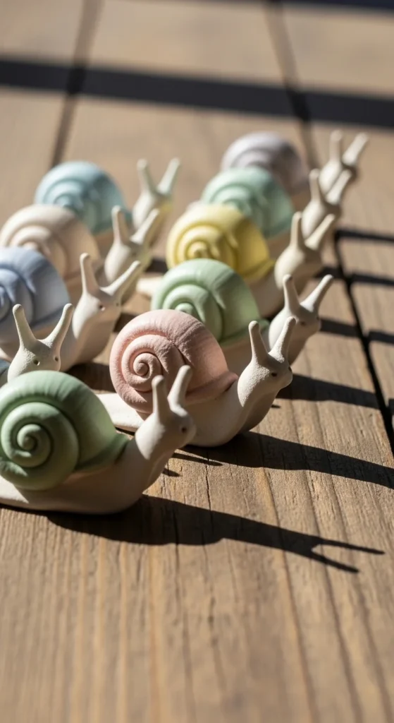 Little snails are charming and built from very basic forms. Roll a thin clay strand and coil it tightly to form the shell spiral. Press gently so the layers stick together without losing the spiral shape. Shape a small oval for the body and attach the shell on top. Add two tiny antennae using very thin clay pieces or mark them lightly with a tool. Smooth the join where the shell meets the body so it looks secure. After drying, paint the shell in soft pastel tones and the body in a neutral color. These snails make sweet decorations for plant pots or shelves and help beginners practice coiling techniques and gentle assembly of separate parts.
