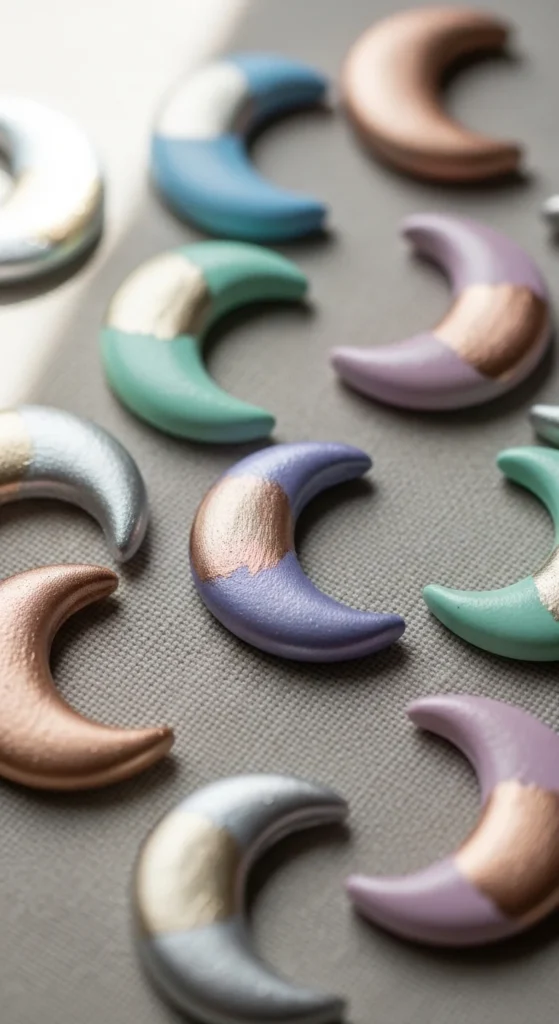 Mini moon charms focus on shaping smooth curves, which is a useful beginner skill. Start by rolling a small ball and flattening it slightly into a thick circle. Use your fingers or a small tool to pinch one side inward, forming a crescent shape. Smooth the edges so the curve looks soft and even. Add a tiny hole at one end if you want to hang it later. Once dry, paint the moon in silver, gold, or pastel shades for a dreamy look. You can add tiny dots or lines for texture if you like. These crescent moons make lovely charms or ornaments and help beginners gain control when shaping curved forms.
