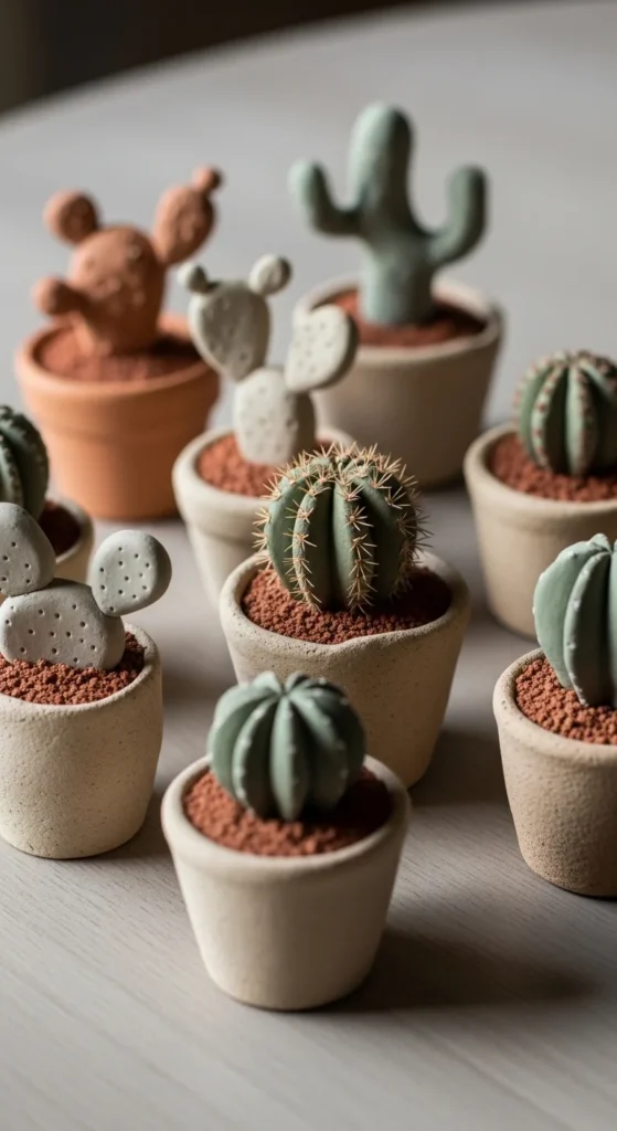 Mini cactus pots combine sculpting and simple assembly in one project. Form a tiny pot by rolling clay into a short cylinder and pressing your finger into the center to hollow it out. Shape a small oval or column for the cactus and attach it inside the pot. Add light line textures with a toothpick to mimic cactus ridges. After drying, paint the pot in earthy tones and the cactus in soft greens, adding tiny white dots as spines. These small clay plants brighten desks and shelves without any upkeep and help beginners practice attaching pieces and adding surface detail.