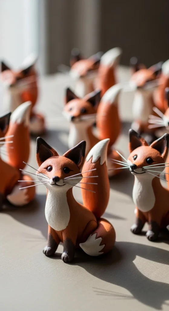 Mini foxes are great for learning pointed shapes along with rounded forms. Start with a small oval body and a slightly smaller oval head. Attach them firmly and smooth the seam. Add two small pointed ears and a curled tail made from a thin clay strand. Press lightly to secure each part. Mark simple eye indents and a small nose before drying. Once hardened, paint the body orange, the tail tip white, and add tiny black eye dots. These foxes make adorable decorations and help beginners practice shaping pointed details while keeping the overall figure simple.