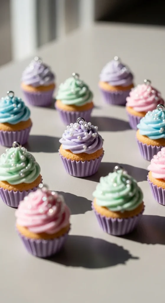 Mini cupcakes are playful and perfect for learning texture. Form a tiny cylinder for the cupcake base and press vertical lines around it using a toothpick to mimic the paper wrapper. Roll a small clay coil and swirl it on top to create frosting. Keep the swirl tight so it doesn’t collapse. Add tiny dot sprinkles or a small heart on top. After drying, paint the base in soft browns and the frosting in pastel colors. These cupcakes make sweet charms or decorations and help beginners practice adding surface texture and shaping spirals.