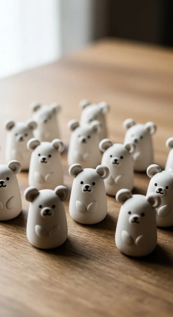 Mini bears rely on soft rounded shapes, making them beginner-friendly. Form a small oval for the body and a round head. Add two tiny round ears and a small snout piece. Smooth all joins so the figure looks unified. Mark small eye and nose spots with a tool. After drying, paint in brown or pastel tones and add darker dots for features. These bears make cute shelf decorations and help beginners gain confidence with simple sculpted animals.