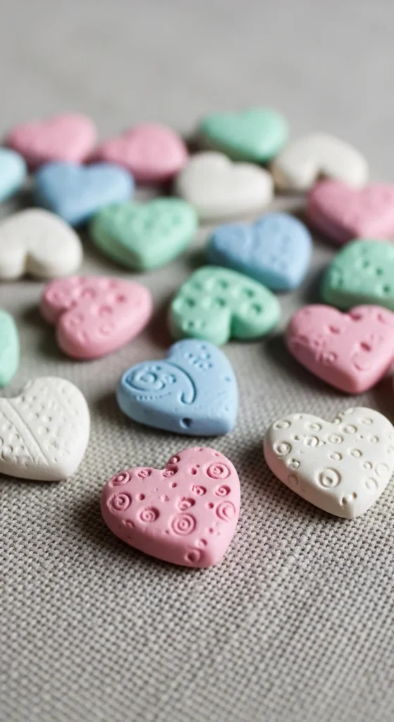 Heart charms are simple, quick, and perfect for jewelry or decorations. Roll a small clay ball, gently pinch one end to form the point, and press the top to create the two rounded lobes. Smooth the surface with your fingertips to remove cracks. Poke a small hole at the top before drying if you want to turn it into a charm. Once hardened, paint in solid colors or add tiny patterns like dots or stripes. These hearts help beginners practice symmetry and smoothing while making pieces that can become keychains, necklaces, or gift tags.