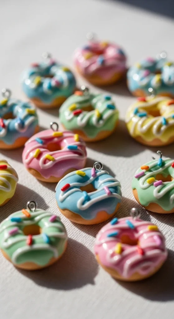Mini donuts are perfect for learning small details and surface decoration. Roll a tiny ball, flatten it slightly, and poke a hole through the center with a toothpick. Smooth the edges so the donut shape looks rounded. After drying, paint the top half as icing in pink, mint, or chocolate tones, then add sprinkle dots with a fine brush. Add a small hole before drying if you want a charm. These donuts make cute keychains or earrings and help you practice shaping even circles and painting tiny patterns.