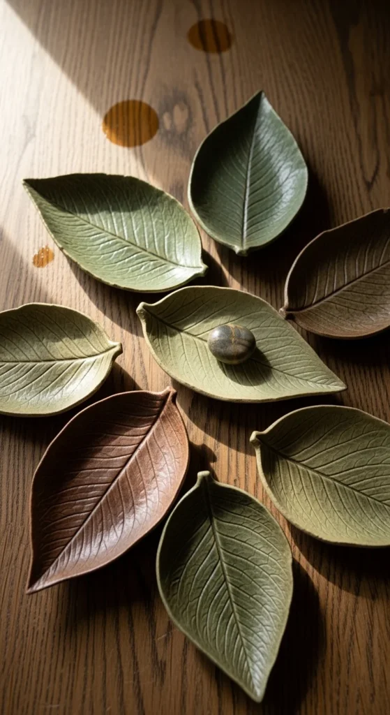 Leaf dishes are decorative and useful at the same time. Flatten a small piece of clay and shape it into a leaf using your fingers or a small tool. Draw vein lines with a toothpick for texture, then gently curve the clay over a spoon so it dries into a shallow bowl shape. Once hardened, paint in greens, browns, or metallic shades. These mini dishes are perfect for holding rings or earrings and help beginners practice flattening clay and adding surface texture.