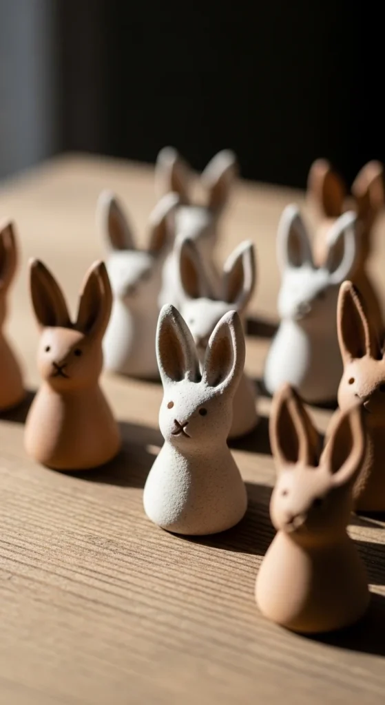 Little bunnies use simple rounded forms that are easy to assemble. Shape a small oval for the body and add two thin pieces for the ears. Smooth where they join so they stay secure. Press tiny indents for eyes and a nose with a toothpick. After drying, paint in white or soft pastel tones. These mini bunnies look adorable as seasonal decor and help beginners practice attaching small parts.