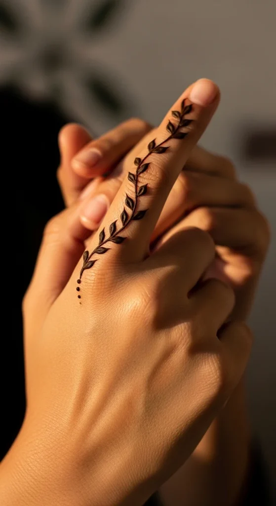 A single finger vine is one of the cleanest minimal looks. Run a thin line from the base of the index finger toward the tip. Add tiny leaves on one side only. Keep each leaf small and evenly spaced so the design stays light. This style looks especially polished when the rest of the hand is left bare. It also pairs well with rings because it doesn’t fight for attention. If you want a slightly richer finish, add a small dot trio near the knuckle. That tiny detail makes the design feel complete while still looking modern. Keep the lines thin and avoid thick outlines. The charm of this design is the negative space around it. It reads well in photos, looks neat from far away, and still feels festive without filling the whole hand.