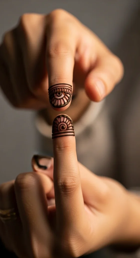A thin ring band design mimics delicate jewelry and looks very modern. Choose one finger—middle or ring finger usually looks best. Draw two thin parallel lines around the finger with a tiny gap between them. On the top side, add three small dots or one tiny leaf to give it a finished look. Keep the band slim so it looks like a fine ring rather than a bold stripe. This style works beautifully for people who want minimal mehndi that still feels “done.” It’s also great if you want to keep your palms clean. For a balanced look, keep the rest of the hand bare or add one tiny dot near the wrist. The simplicity is what makes it look classy.