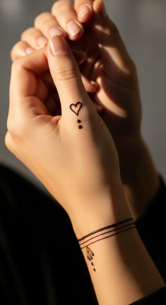 A micro heart can look classy when it’s kept small and placed neatly. Put a tiny heart near the thumb base, the side of the wrist, or close to the index finger base. Keep the heart outline thin and clean. Add one or two tiny dots near it for balance. This design works well for a casual event or a simple gathering. The key is keeping the heart small enough that it reads like a fine detail. Pair it with minimal jewelry and let the heart be the only motif on the hand for a clean modern finish.