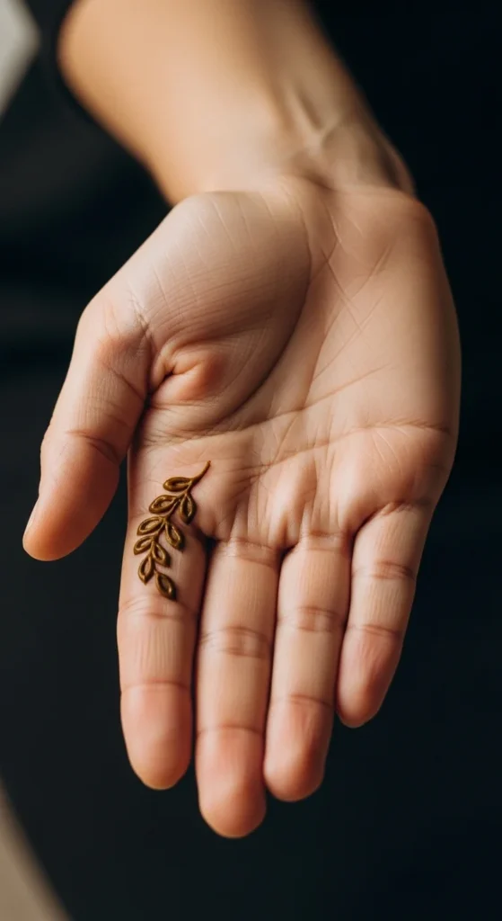 A bare palm with a small corner detail looks modern and clean, especially if you don’t want anything in the center of the palm. Place a tiny leaf cluster near the base of the thumb on the palm side. Keep it compact and let the rest of the palm stay empty. This design looks neat in photos when your palm is slightly visible. Keep the leaves thin and add one tiny dot at the end to finish the cluster. The result feels intentional, simple, and elegant.