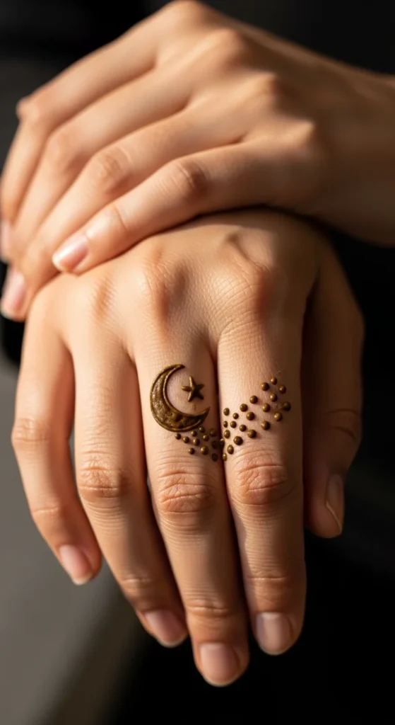 A small crescent near the knuckle gives a modern, delicate focal point. Place it near the base of the middle finger knuckle or slightly off-center on the back of the hand. Draw a thin crescent shape, then add a tiny dot cluster beside it. Keep the dots small and close together so the crescent stays the star. This design looks especially good with clean nails and simple rings. It’s a great choice for people who like minimal tattoo-style designs but want the warmth of mehndi. Keep the crescent thin and avoid adding too many extra elements around it.