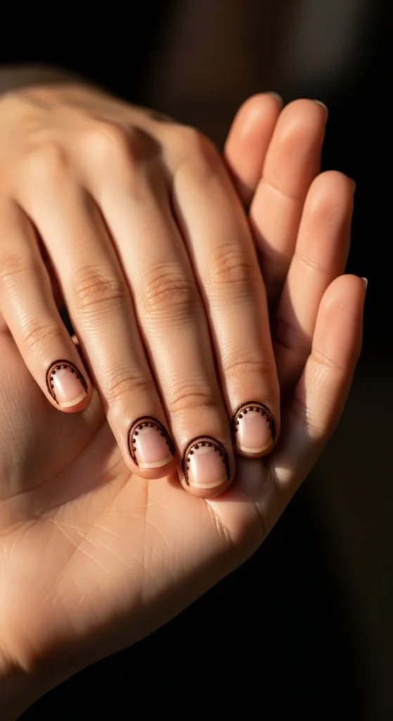 Cuticle detailing looks neat and modern because it frames the nail area without covering the finger. Draw a thin curved line hugging the base of the nail on one or two fingers. Add two tiny dots on the side to finish the shape. This style is subtle but looks very styled in close-up photos. Keep the line thin and smooth so it looks clean. Avoid doing it on every finger if you want a more modern vibe—two or three fingers is enough for a balanced look.